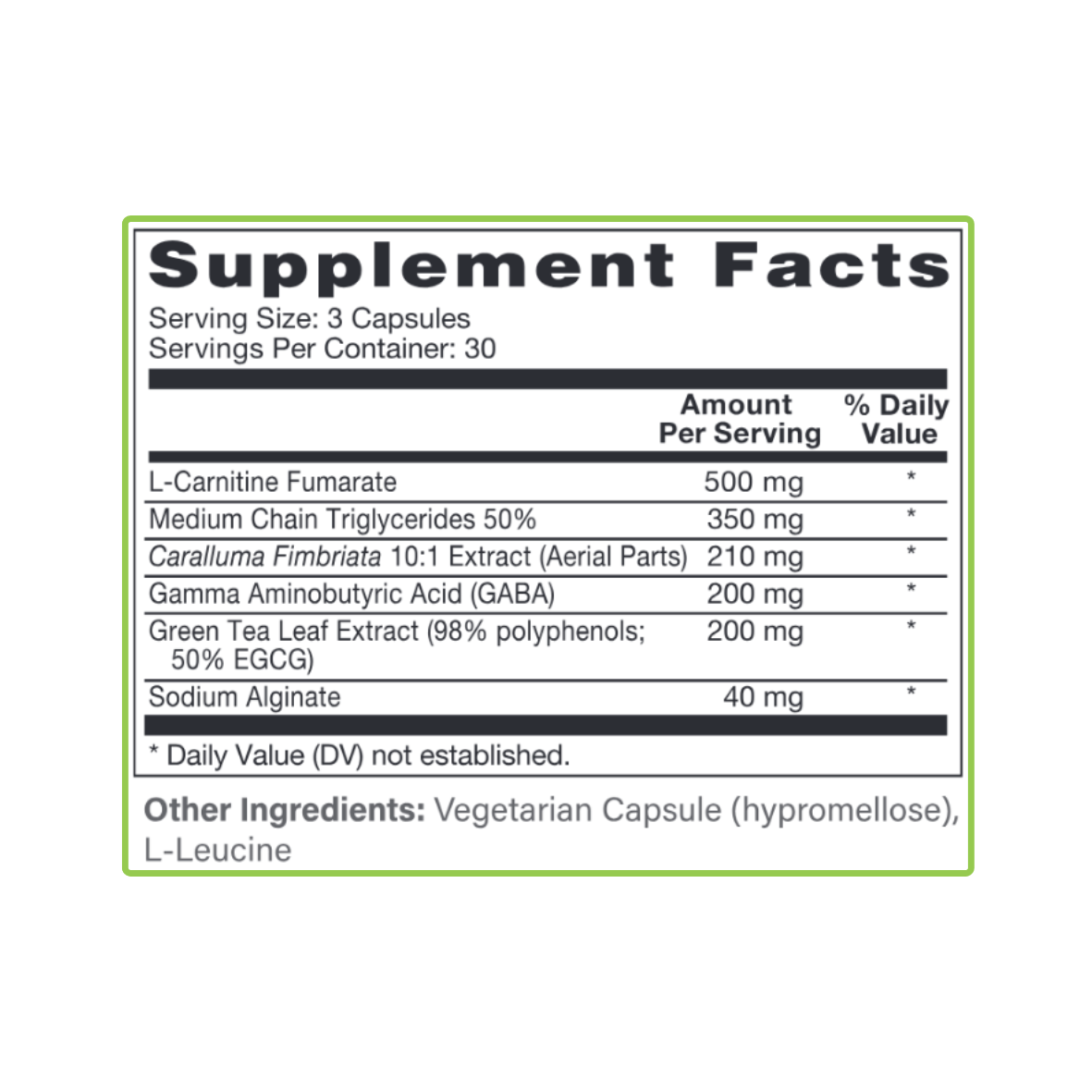 This herb is a natural appetite suppressant and energy enhancer derived from the succulent Asian cactus plant. ³⁻⁴ It has been used by tribal Indians to suppress hunger, quench thirst, and enhance endurance. It has been shown to suppress appetite, and reduce waist circumference. Caralluma contains key phytochemicals including pregnane glycosides, flavone glycosides, megastigmane glycosides, bitter principles, saponins, and various other flavonoids.⁵ The appetite suppressing action of Caralluma can be attributed to the pregnane glycosides which amplify signaling of the energy-sensing function in the basal hypothalamus and acts directly on the adipose tissue by inhibiting adipocyte proliferation and differentiation.⁶⁻⁷ Caralluma fimbriata may downregulate ghrelin synthesis in the stomach and neuropeptide-Y in the hypothalamus both having the effect of appetite suppression.⁸ Caralluma Fimbriata also has the ability to inhibit the proliferation of pre-adipocytes to reduce new fat cells.⁹