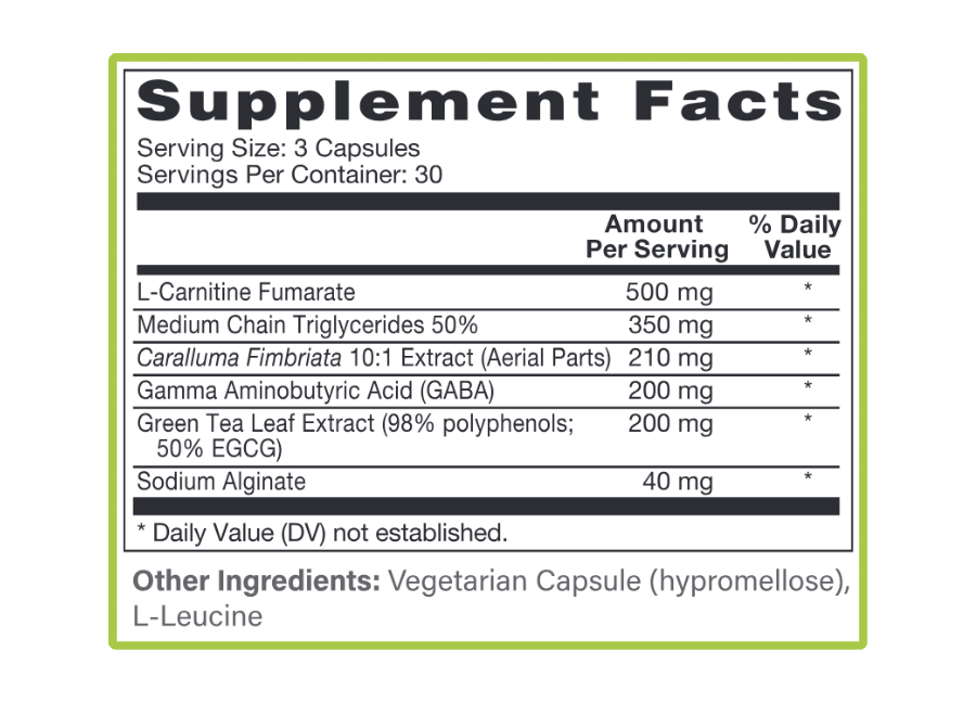 This herb is a natural appetite suppressant and energy enhancer derived from the succulent Asian cactus plant. ³⁻⁴ It has been used by tribal Indians to suppress hunger, quench thirst, and enhance endurance. It has been shown to suppress appetite, and reduce waist circumference. Caralluma contains key phytochemicals including pregnane glycosides, flavone glycosides, megastigmane glycosides, bitter principles, saponins, and various other flavonoids.⁵ The appetite suppressing action of Caralluma can be attributed to the pregnane glycosides which amplify signaling of the energy-sensing function in the basal hypothalamus and acts directly on the adipose tissue by inhibiting adipocyte proliferation and differentiation.⁶⁻⁷ Caralluma fimbriata may downregulate ghrelin synthesis in the stomach and neuropeptide-Y in the hypothalamus both having the effect of appetite suppression.⁸ Caralluma Fimbriata also has the ability to inhibit the proliferation of pre-adipocytes to reduce new fat cells.⁹