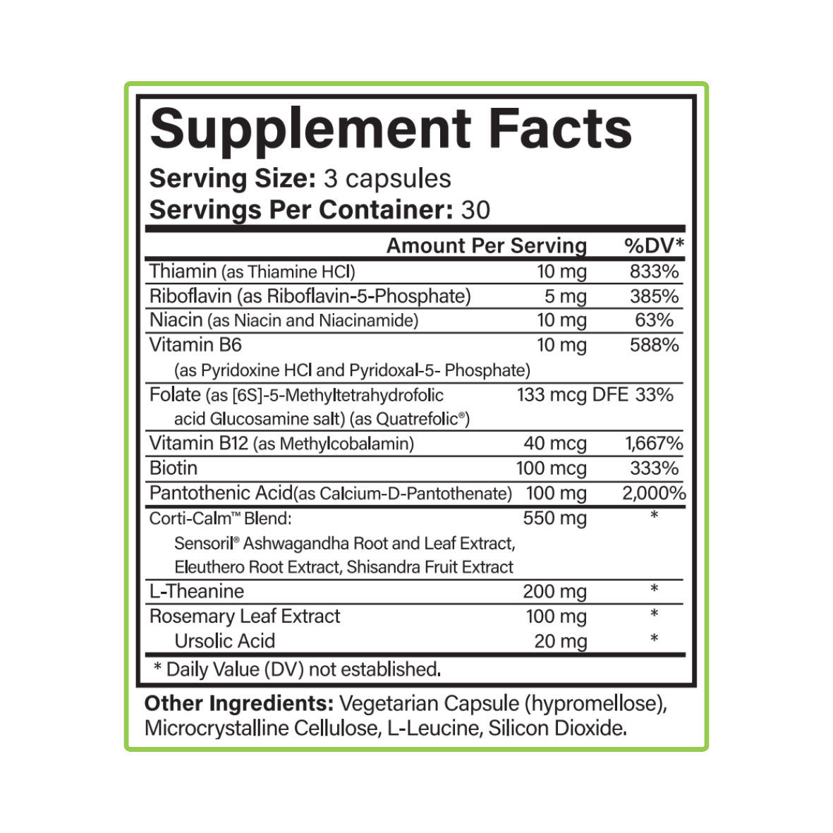 The formula also incorporates a robust B-vitamin complex, replenishing crucial nutrients that stress rapidly depletes.